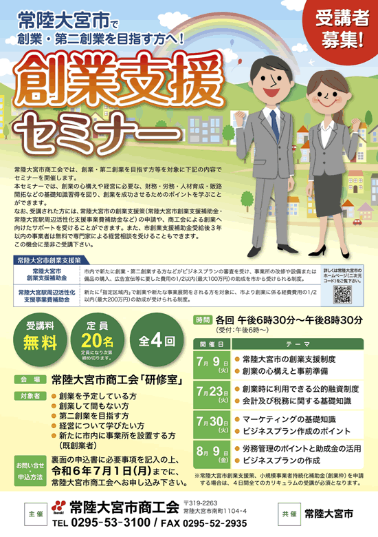 【創業支援セミナー】 常陸大宮市商工会では、会社を設立したい方やお店を開きたい方、創業して間もない方を対象に、独立開業に必要な創業計画・資金調達・財務管理・マーケティングなどの知識習得を目的としたセミナーを開催しています。